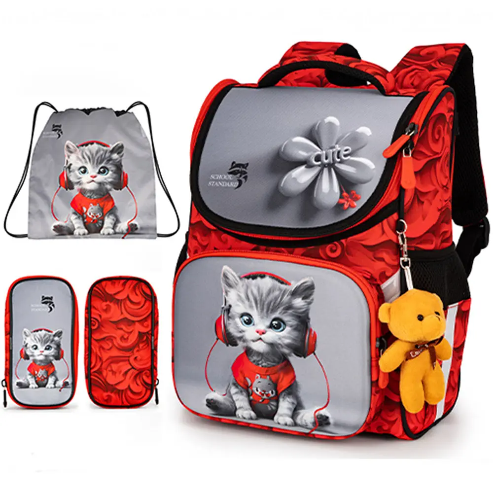 Ортопедичний рюкзак (ранець) з пеналом та мішком для дівчинки School Standard з Котом для початкової школи (Full 300-7)