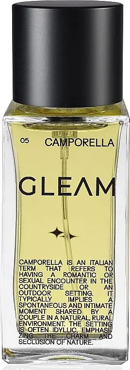 Gleam Camporella Extrait De Parfum — зелений квітковий аромат для жінок і чоловіків, випущений у 2025 році. Він належить колекції Villeggiatura, яка поєднує парфуми з настроєм відпустки та безтурботного літа. Camporella втілює сільську ідилію, аромат зігрітих сонцем польових квітів і трав, задоволення від ромашкового чаю та абсолютне умиротворення, розлите у повітрі.