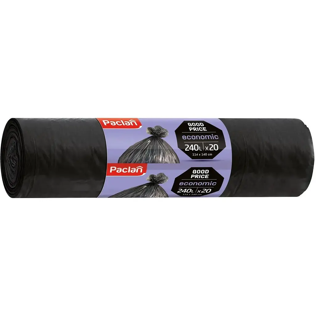Зручні та практичні мішки для сміття Paclan Economic об'ємом 240 літрів ідеально підходять для зберігання та утилізації відходів. вдома, на дачі або в офісі. Вони виготовлені з міцного поліетилену, стійкого до розривів та проколів, що забезпечує надійність у використанні. Компактне упакування містить 20 мішків, що робить їх зручними для регулярного використання будинку, на дачі або в офісі.
