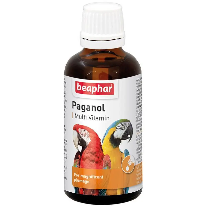 Вітамінна кормова добавка у формі крапель Paganol для зміцнення оперення декоративних птахів. Допомагає при авітамінозах. Незамінна під час оновлення пір'я. Запобігає тьмяності оперення, облисінню та самовищипуванню пір'я. Містить комплекс вітамінів, які допомагають підтримувати здоров'я шкіри та оперення.