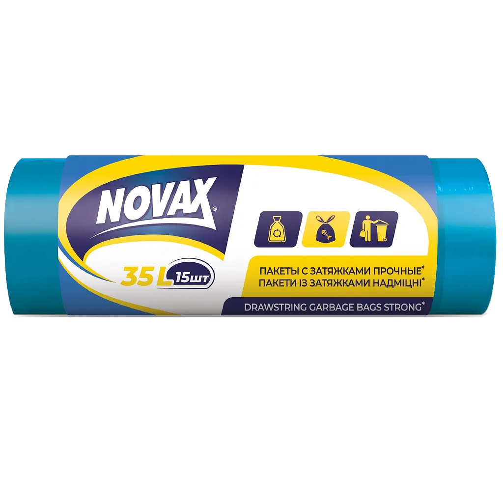 Пакети для сміття із затяжкою Novax призначені для сміттєвого бака об'ємом до 35 л.