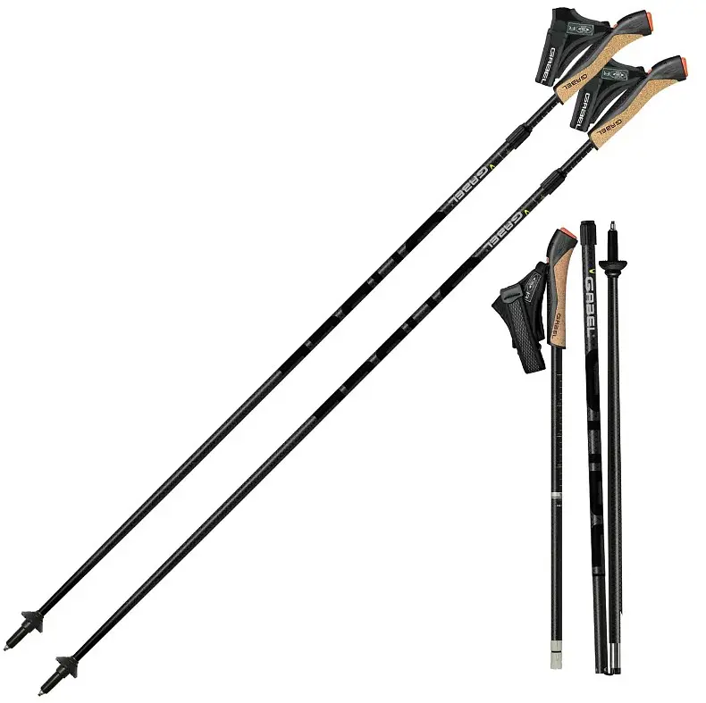 Трисекційні палиці мають верхню (більш зручну) телескопічну систему регулювання висоти в межах від 105 до 130 см і систему складання Twist Lock, завдяки чому в транспортному положенні мають довжину всього 52 см. Прогресивна технологія Snake Carbon, за якою виготовлені карбонові секції палиць, збільшує міцність на злам, зменшує вагу і дозволяє ефективніше гасити вібрації, надаючи палицям привабливий агресивний зовнішній вигляд. Рукоятка має двошарову накладку з корку, що перешкоджає потовиділенню, і оснащена системою швидкого відстібання ремінця. Потрібний нахил рукоятки, ефективний крій темляка і форма чобітка сприяють формуванню правильної техніки скандинавської ходьби.