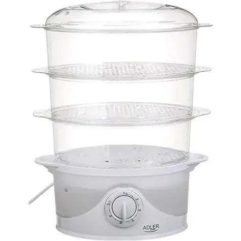 Функціональна пароварка Adler AD 633 потужністю 800 Вт. Завдяки багатошаровим контейнерам дозволяє готувати кілька страв одночасно.