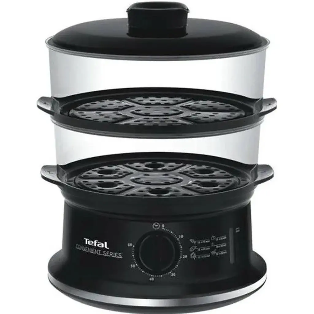 Пароварка Tefal VC1401 потужністю 900 Вт виготовлена в чорному пластиковому корпусі та укомплектована двома прозорими пластиковими чашами зі знімними гратами. Для зручності зберігання чаші складаються одна в одну, не займаючи багато місця, а прибравши грати, можна разово приготувати велику кількість їжі. Модель оснащена 60-хвилинним механічним таймером, що автоматично вимикає її зі звуковим сигналом після закінчення часу. У резервуарі для води є індикатор рівня, воду можна доливати під час готування через зовнішній отвір. Знімні деталі пароварки Tefal VC1401 після закінчення роботи легко миються в посудомийній машині або вручну.