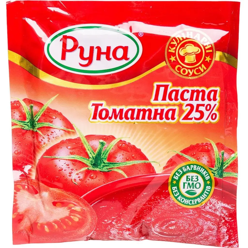 Паста томатна Руна 25% має виразний смак та аромат, без якого не обійтися у приготуванні різноманітних страв, включаючи пасти, соуси, супи, піцу та багато іншого. Концентрована, з кислинкою, з вираженим помідорним смаком та ароматом, густою консистенцією.