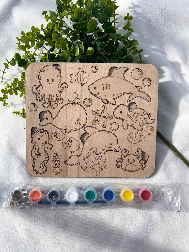 У наборі: дерев'яна основа, фігурки тварин, фарби та пензлик