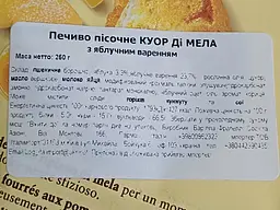 Хрустка пісочна основа печива гармонійно доповнюється ніжною начинкою з яблучного джему, яка має солодко-кислуватий смак із природними фруктовими нотками.