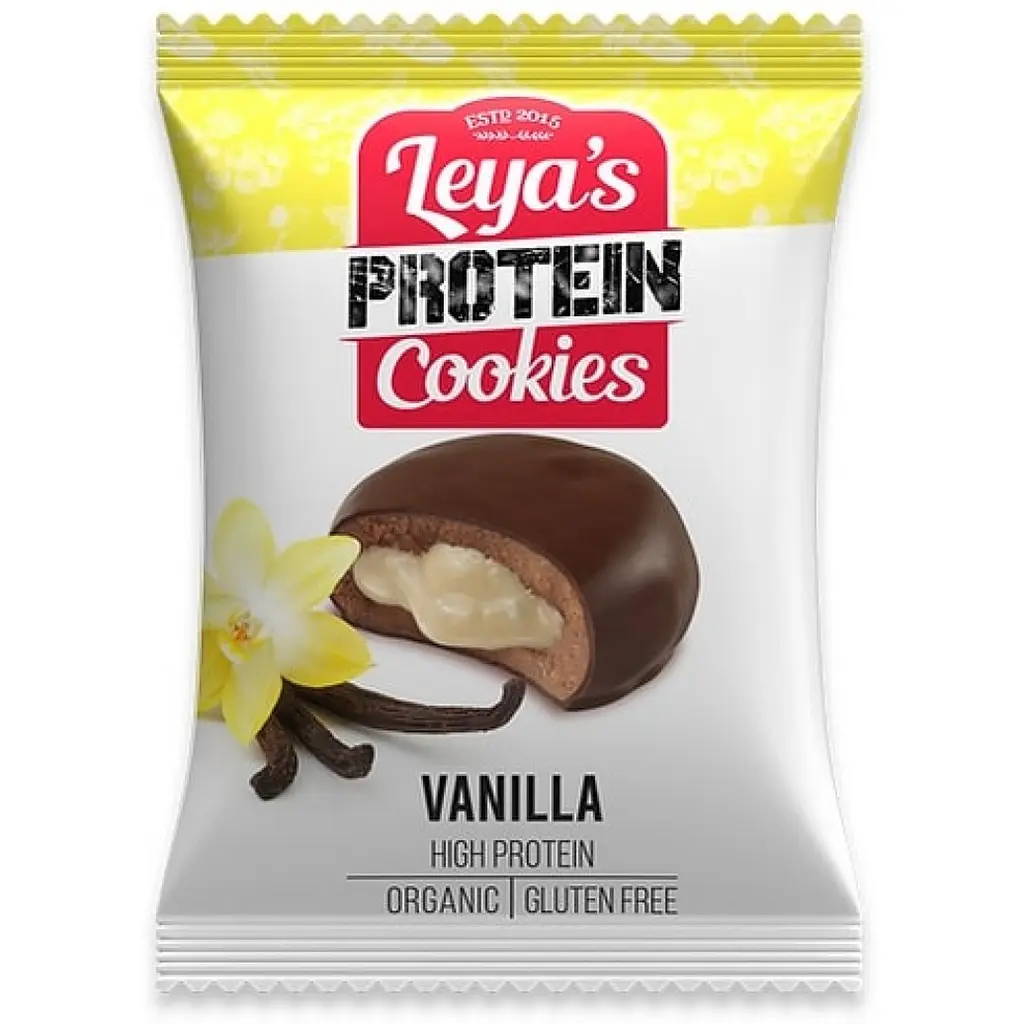 Leya's Protein Cookie - білкове печиво в темному шоколаді - ванільне. Симфонія пухкої ванільної начинки та органічного крему з кеш'ю, загорнута в соковиту пасту з гороховим протеїном, і все це ніжно огорнуте в темний шоколад. Насолоджуйтесь миттю райської насолоди - незалежно від того, куди вона приведе вас протягом дня та року. Корисний перекус, в який ви закохаєтесь з першого шматочка. Візьміть його з собою на роботу, заняття фітнесом або в подорож і насолоджуйтеся цим смачним перекусом з 24% білка, коли вам захочеться солодкого.