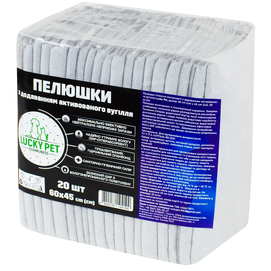Пелюшки гігієнічні Lucky Pet з активованим вугіллям виготовлені з гіпоалергенної сировини. Завдяки особливому тисненню рідина розподіляється рівномірно. Тиснення створює додатковий бар`єр, який перешкоджає розтіканню рідини та надає пелюшці додаткову надійність. Додавання активованого вугілля забезпечує додатковий антибактеріальний захист та максимально ефективно нейтралізує неприємні запахи. Використання суперабсорбенту SAP забезпечить ще краще поглинання неприємних запахів.