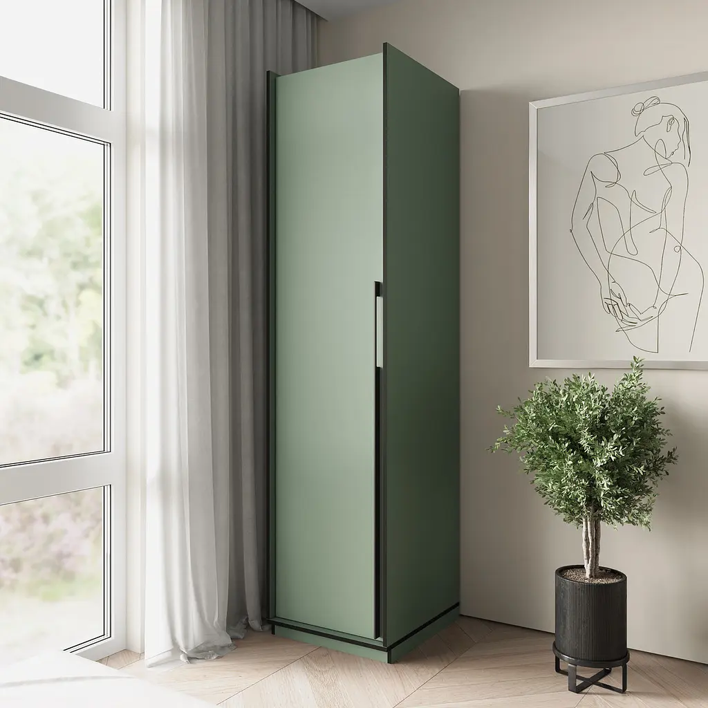 Пенал для дому - це зручна і функціональна шафа для зберігання речей та інших предметів. Виготовлений з ЛДСП, що забезпечує довговічність та міцність конструкції. Пенал обладнано штангою для зручного розміщення речей. Дверцята оснащені петлями з доводчиком, що забезпечує плавне закривання. Чорна фурнітура та металеві ручки надають пеналу стильного та сучасного вигляду. Чорна кромка товщиною 1 мм надає виробу додаткової міцності та захищає від пошкоджень. Кріплення на рафіксах та мініфіксах забезпечує надійність конструкції. На антресолях використовуються тіпони.