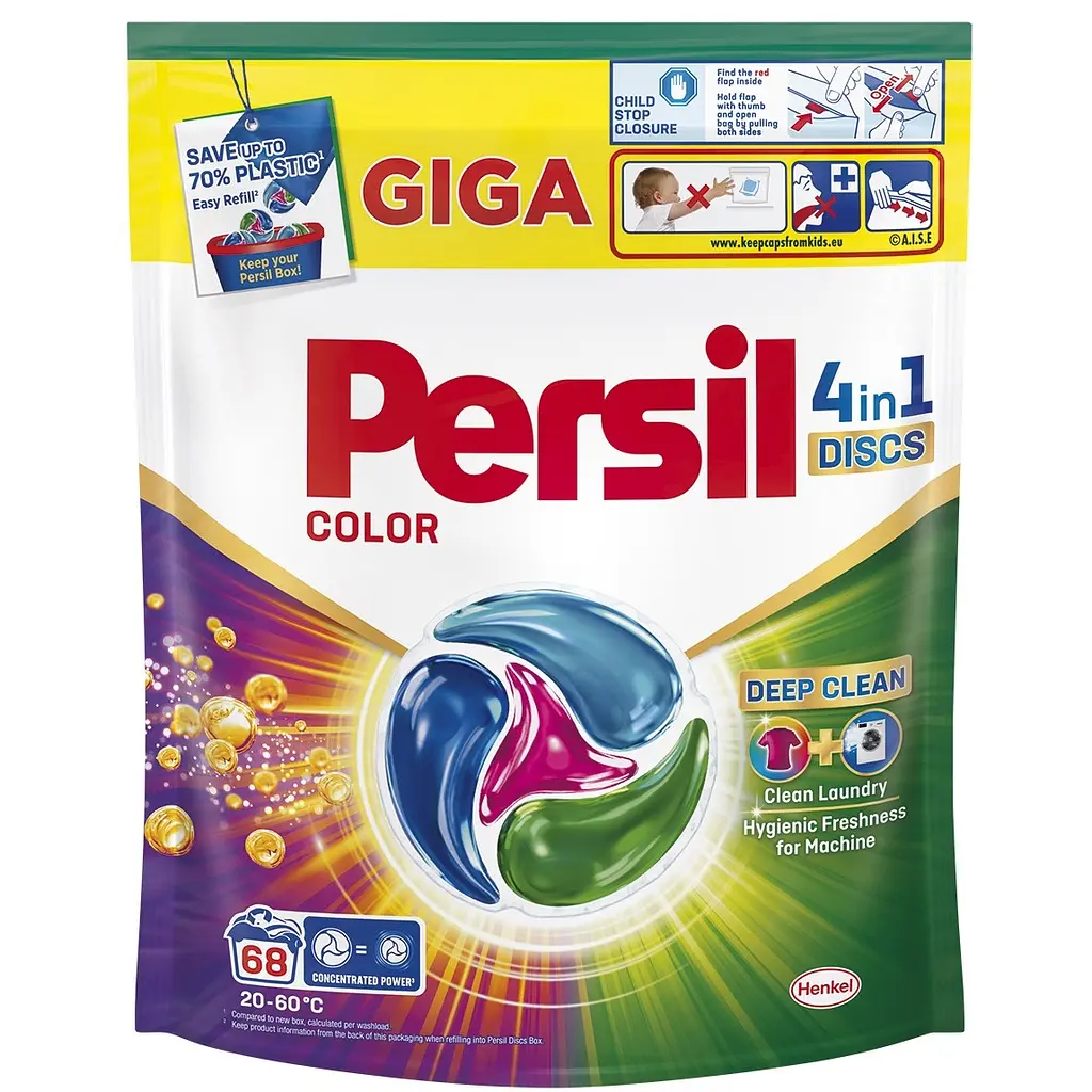 Формула Persil допомагає забезпечити ефективне видалення забруднень, зберігаючи при цьому яскравість одягу, навіть після декількох циклів прання. Диски Колор використовують для прання кольорових речей.