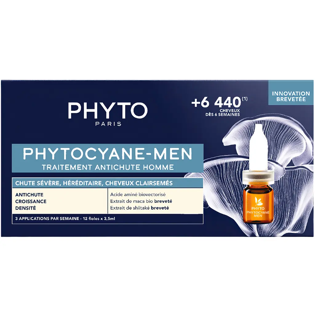 Найновіша розробка фахівців Лабораторії Фіто – Phyto Phytocyane Traitement Antichute Homme для боротьби з важкими формами прогресуючого випадання волосся у чоловіків. Фітоціан-Мен Сироватка не тільки знижує випадання, але й значно підвищує щільність та якість волосся за рахунок запатентованого екстракту грибів шиїтаке, який покращує харчування волосяних фолікул.