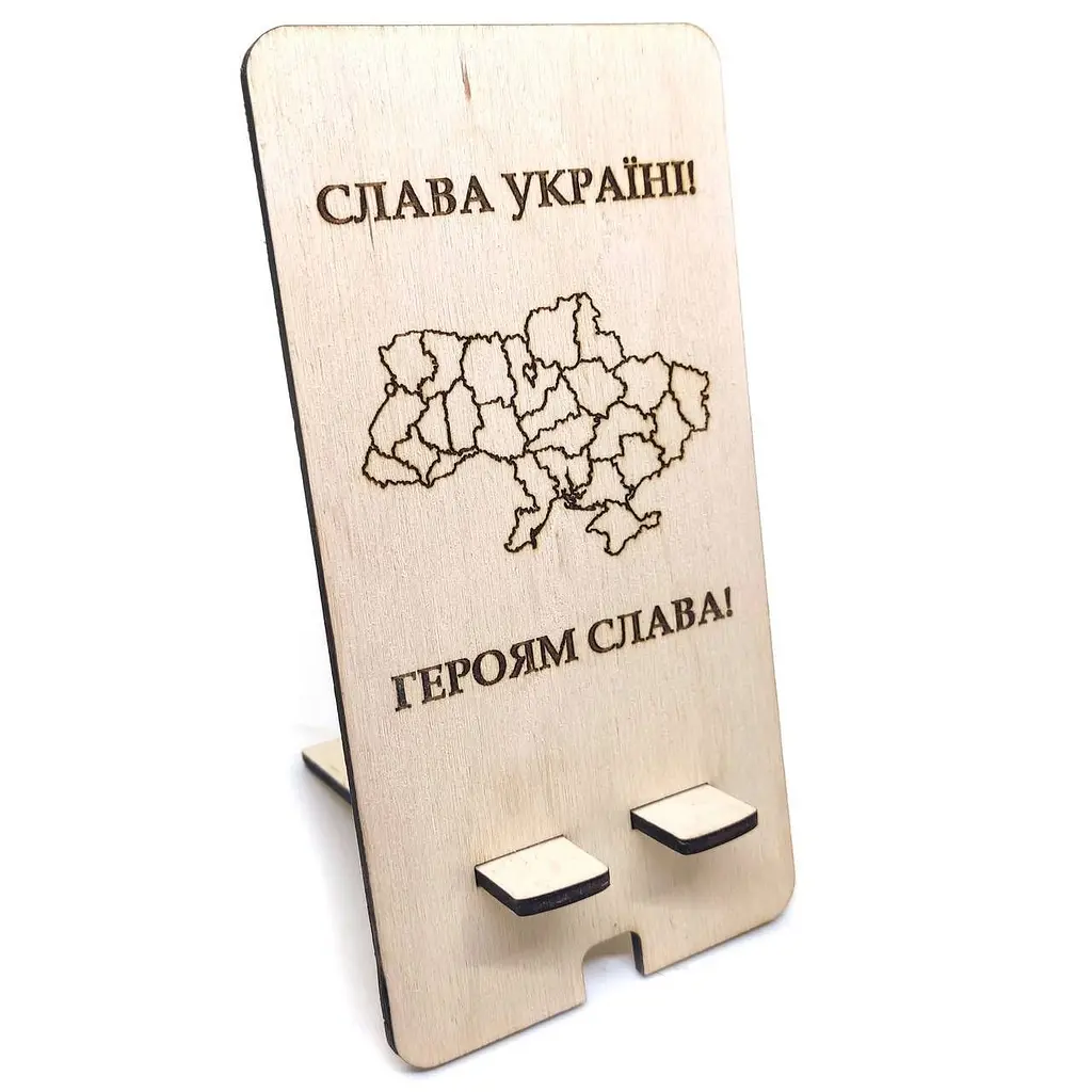 Дерев’яна підставка з патріотичним гравіюванням карти України та написом «Слава Україні! Героям слава!». Стильний аксесуар і символ підтримки країни.