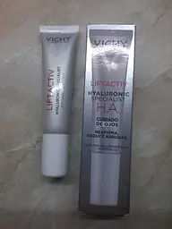 Ліфтактив Гіалуронік Спеціаліст Ейч Ей, крем для зони навколо очей, містить у складі чисту гіалуронову кислоту, вітамін Сg та кофеїн, що сприяють відновленню гіалуронової кислоти, поступовому зміцненню та розгладженню шкіри.