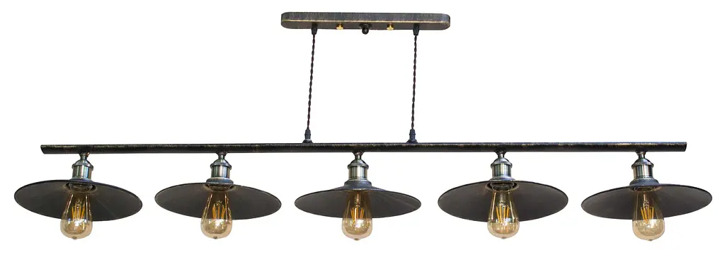 Тип: Підвіси Стиль: Лофт Матеріал основи: Метал Колір основи: Бронза Матеріал плафона: Метал Колір плафона: Бронза Рекомендований тип лампи: Світлодіодна лампа Лампа в комплекті: Немає Кількість джерел світла: 5 Додатково: Декоративний провід Клас захисту (IP): IP20 Напруга мережі: 220-240 Тип цоколя: E27 Тип кріплення: Пластина Потужність (Вт): 60 Висота (мм): 500 Ширина (мм): 1450