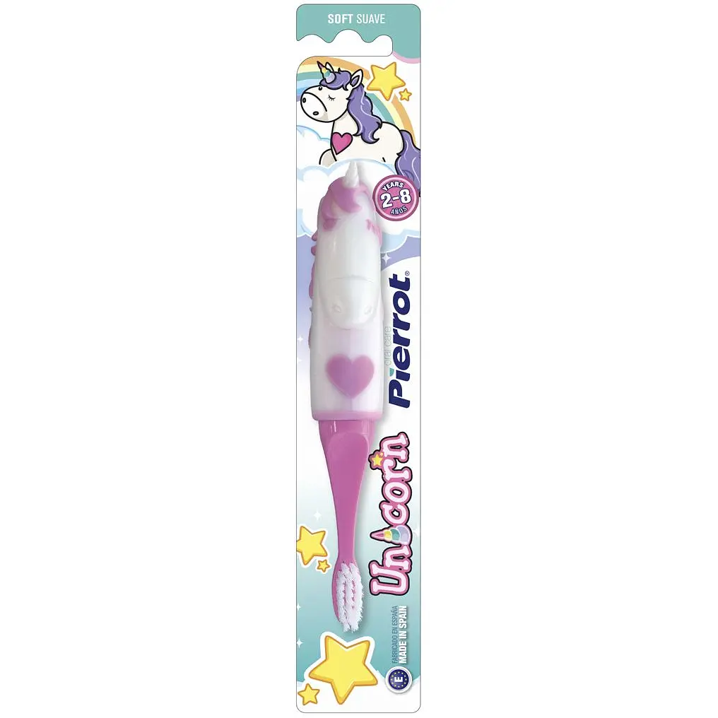 Яскравий дизайн дитячої компактної зубної щітки Pierrot Unicorn обов'язково сподобається вашій дитині. Невелика головка з м'якими заокругленими на кінцях щетинками делікатна до дитячої емалі та ясен та забезпечує необхідний догляд.