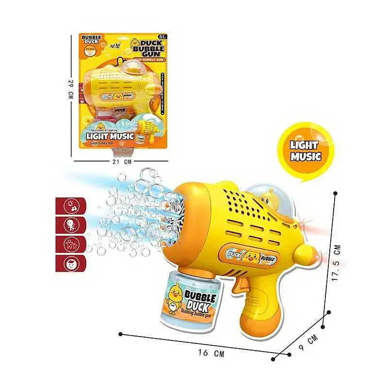 Пістолет з мильними бульбашками, на батарейках, з музичними та світловими ефектами, з мильним розчином створює море мильних бульбашок із музикою та яскравими світловими ефектами. Виготовлений із безпечного пластику, працює на батарейках, включає мильний розчин. Легкий у використанні, ідеально для дитячих свят на свіжому повітрі. Сприяє веселій грі та розвитку уяви. Створюйте чарівні моменти!