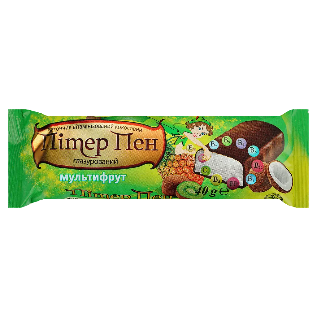 Батончик Пітер Пен вітамінізований кокосовий у шоколадній глазурі з фруктовим коктейлем може бути використаний в раціонах дієтичного харчування для загального зміцнення організму як додаткове джерело білків, жирів, вуглеводів, вітамінів, макро- і мікроелементів.