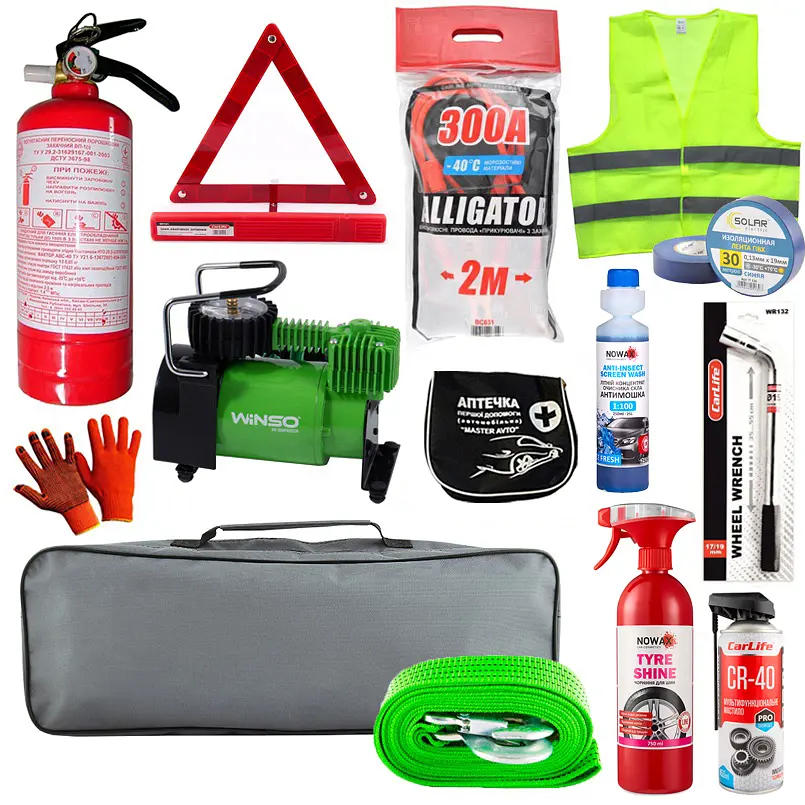 Вогнегасник порошковий ВП2 VP2-X Знак аварійної зупинки Чорнитель і блиск для шин Nowax Tyre Shine, 750мл NX75006 Провода-прикурювачі Alligator 300А, 2м (поліет. пакет) BC631 Аптечка перш.мед.допомоги типу АМА1,сумочка (мала) AMA1, sumochka (mal.) Жилет сигнальний BX18110 Стрічка ізоляційна ПВХ Solar, 0.13мм x 19мм, 25м, синя IT125 Розмір (ШхВхГ): 58 х 18 х 13 см Компресор автомобільний Winso з автостопом 124000 Буксирувальний трос Winso 2,5т, 4м 132540 Змазка багатофункціональна CarLife CR-40 Multifunctional Lubricant Professional, 450мл CF453 Рукавиці покриті нітрилом WG08 Ключ колісний CarLife телескопічний 17x19мм WR132 Омивач скла Nowax Anti Insekt літній Ice Fresh концентрат 250мл NX25125 Cумка органайзер велика