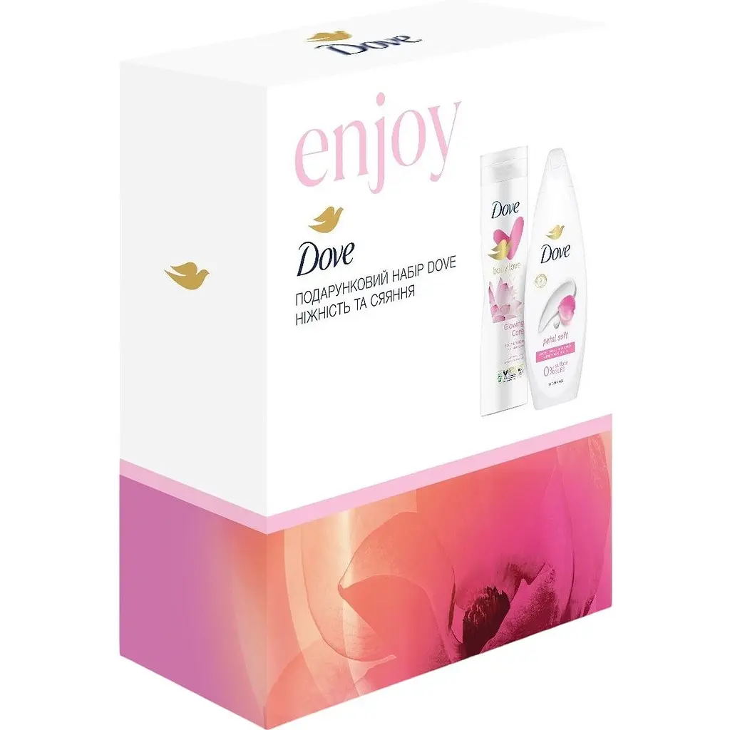 Подарунковий набір Dove Ніжність та сяяння стане чудовим подарунком для представниць прекрасної половини людства. Крем-гель для душу та лосьйон для тіла, що є у його складі, зроблять щоденні гігієнічні процедури максимально приємними, а головне - ефективними, забезпечивши шкірі потрібний догляд.