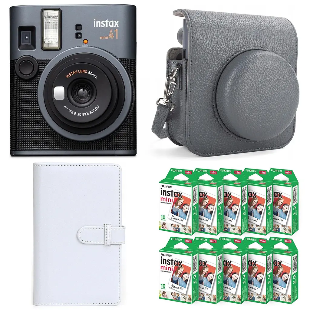 Подарунковий набір Фотоапарат Fujifilm Instax Mini 41 Фотопапір 100 шт. Чохол Фотоальбом на 108 фото сірий - це повний комплект для створення, друку та зберігання найтепліших спогадів. Фотоапарат Fujifilm Instax Mini 41 забезпечує миттєвий друк якісних знімків формату 62×46 мм прямо після натискання кнопки спуску. Його стильний дизайн і проста у використанні система роблять процес фотографування легким і приємним.