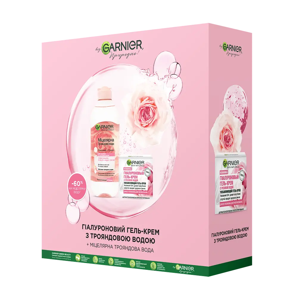 Міцеллярна вода: Aqua / Water, Hexylene Glycol, Glycerin, Rosa Damascena Flower Water, Ppg-26-Buteth-26, Peg-40 Hydrogenated Castor Oil, Arginine, Poloxamer 184, Disodium Cocoamphodiacetate, Disodium Edta, Citric Acid, B. Саліцилова кислота, бромід міртримонію, ліналоол, лімонен, парфуми / ароматизатори. Гель-крем: Аква / вода, гліцерин, диметикон, цетеарил етилгексаноат, денатований спирт, квіткова вода рожи дамасської, поліакрилоілдиметилтаурат амонію, гідроксиетилпіперазин етансульфонова кислота, феноксиетанол, каприлілгліколіколь, міллікон, каприлілкорилміколь, міллікон пропандіол, гіалуронат натрію, ксантанова камедь, динатрій едта, аргінін, гідроксид натрію, лимонна кислота, саліцилова кислота.