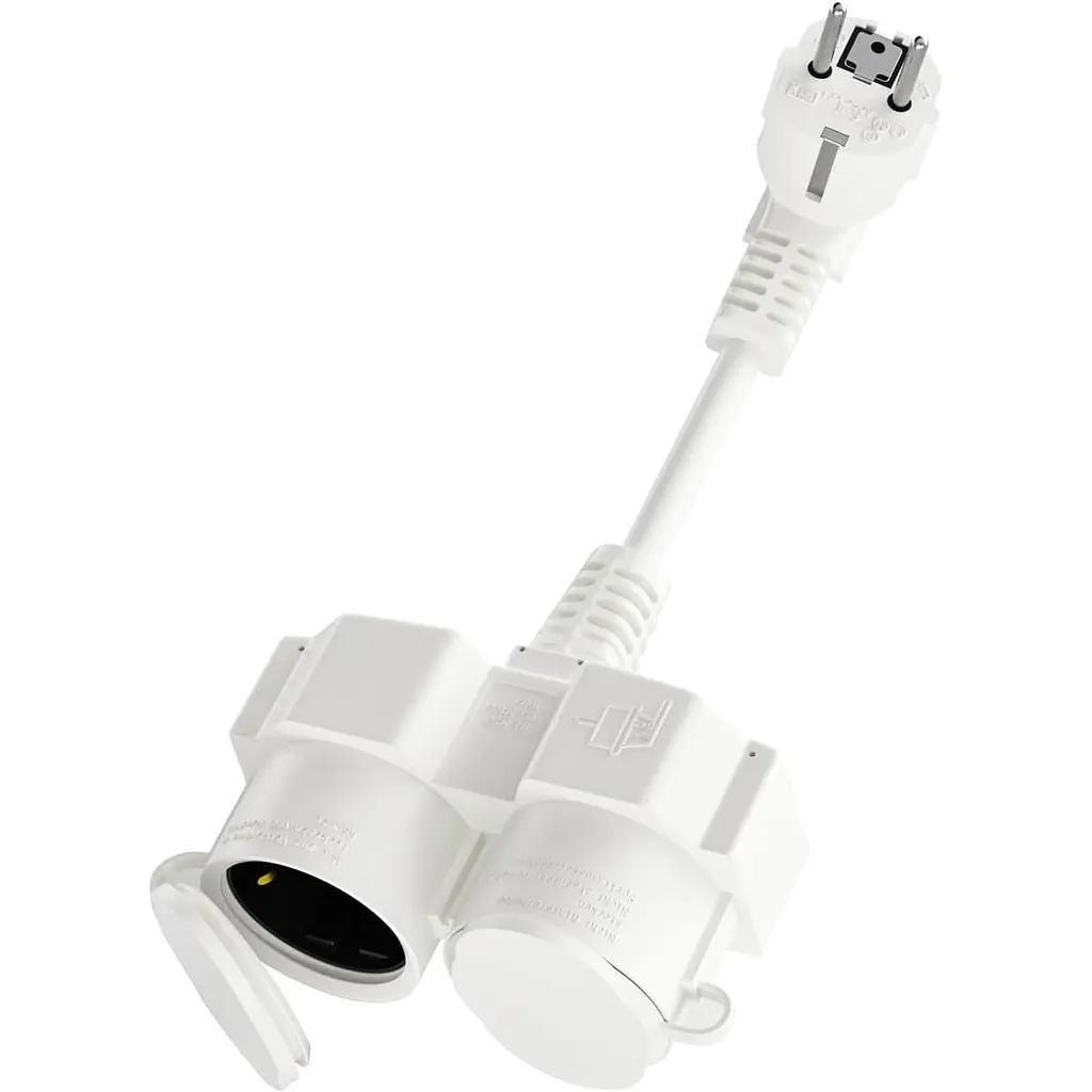 Подовжувач кабелю живлення, короткий, подвійний штекерний кабель із 2 розетками для внутрішнього та зовнішнього використання, 22 см (білий)