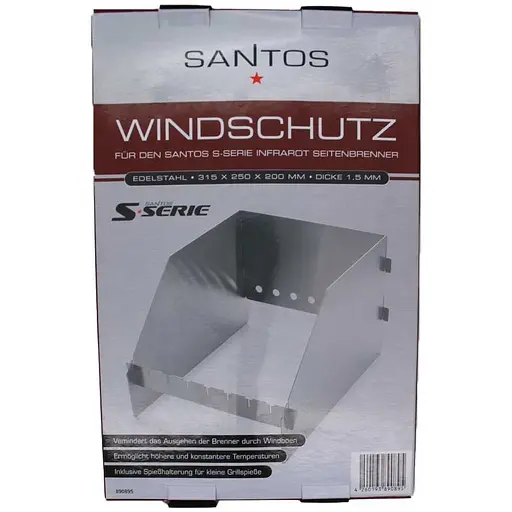 Підставка для шампурів на бічний пальник Santos для газових грилів серії S та E ви захистите свій бічний пальник від згасання під час сильних поривів вітру. Це особливо корисно при використанні на протягах, оскільки бічний пальник продовжує стабільно горіти, незважаючи на вітер. Вітрозахист виготовлений з високоякісної нержавіючої сталі, тому відрізняється особливою міцністю та довговічністю.