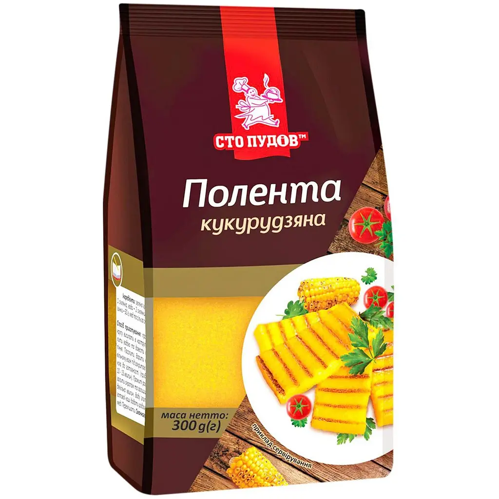Полента Сто пудів - це кукурудзяна крупа дрібного помелу, що є основою традиційної італійської страви. Вона має нейтральний смак і підходить для приготування гарнірів, основних страв або навіть десертів. Вона швидко готується, зберігаючи при цьому всі корисні властивості кукурудзи.