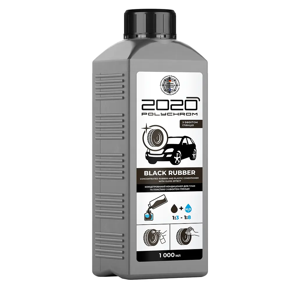Концентрований кондиціонер Polychrom 2020 Black Rubber для гуми та пластику з ефектом глянцю 1 л – це професійний засіб на водній основі, створений для відновлення первинного вигляду та захисту гумових і пластикових елементів автомобіля. Його спеціальна формула глибоко проникає в структуру матеріалу, повертаючи йому насичений чорний колір та надаючи виразного глянцевого блиску. Продукт ефективно запобігає старінню, пересиханню та розтріскуванню деталей, які постійно піддаються впливу зовнішнього середовища.