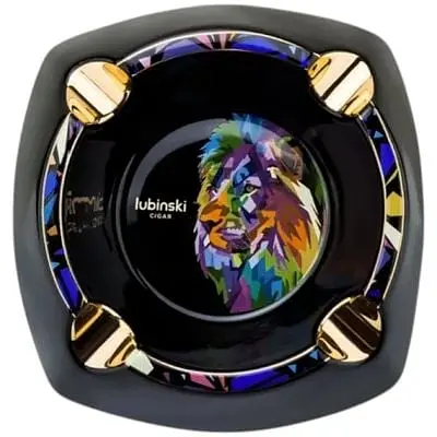 Стильна попільничка з візерунками виконані в чорному кольорі із зображенням різнокольорового лева посередині. Аксесуар стане незамінним аксесуаром в будь-якому приміщенні бенкет даючи йому особливого антуражу. Виріб створено відомим італійським брендом Lubinski, розкішний атрибут будь-якого справжнього поціновувача сигарокуріння.