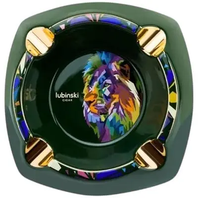 Стильна попільничка з візерунками виконані в чорному кольорі із зображенням різнокольорового лева посередині. Аксесуар стане незамінним аксесуаром в будь-якому приміщенні бенкет даючи йому особливого антуражу. Виріб створено відомим італійським брендом Lubinski, розкішний атрибут будь-якого справжнього поціновувача сигарокуріння.