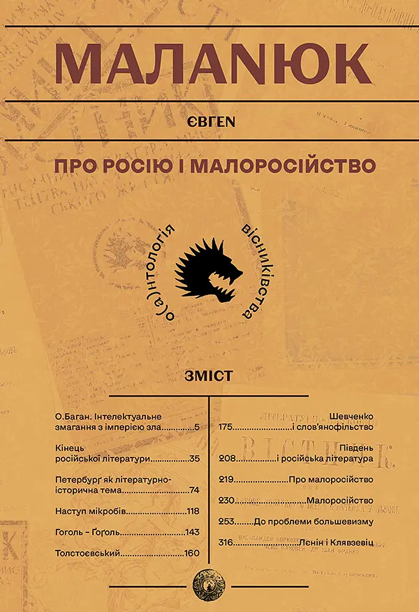 Видання представляє творчу спадщину провідного автора вісниківського середовища Євгена Маланюка (1897-1968), присвячену широкій темі російської ментальності, цивілізації, культури та історії, а також охоплює проблематику становлення і розвитку малоросійства як специфічного феномену. Збірник склали головні його есе на ці теми, які дають можливість "розітнути" складну проблематику російського імперіалізму та російської імперської культури як глобально деструктивних і штучних проєктів, що так фатально відбилися на історії і культурі багатьох народів Східної Европи, передусім українства. Есеїстика містить також велику кількість глибоких спостережень автора про національне буття на перетині розвитку історичних процесів, художньої літератури, етнопсихології і культури.