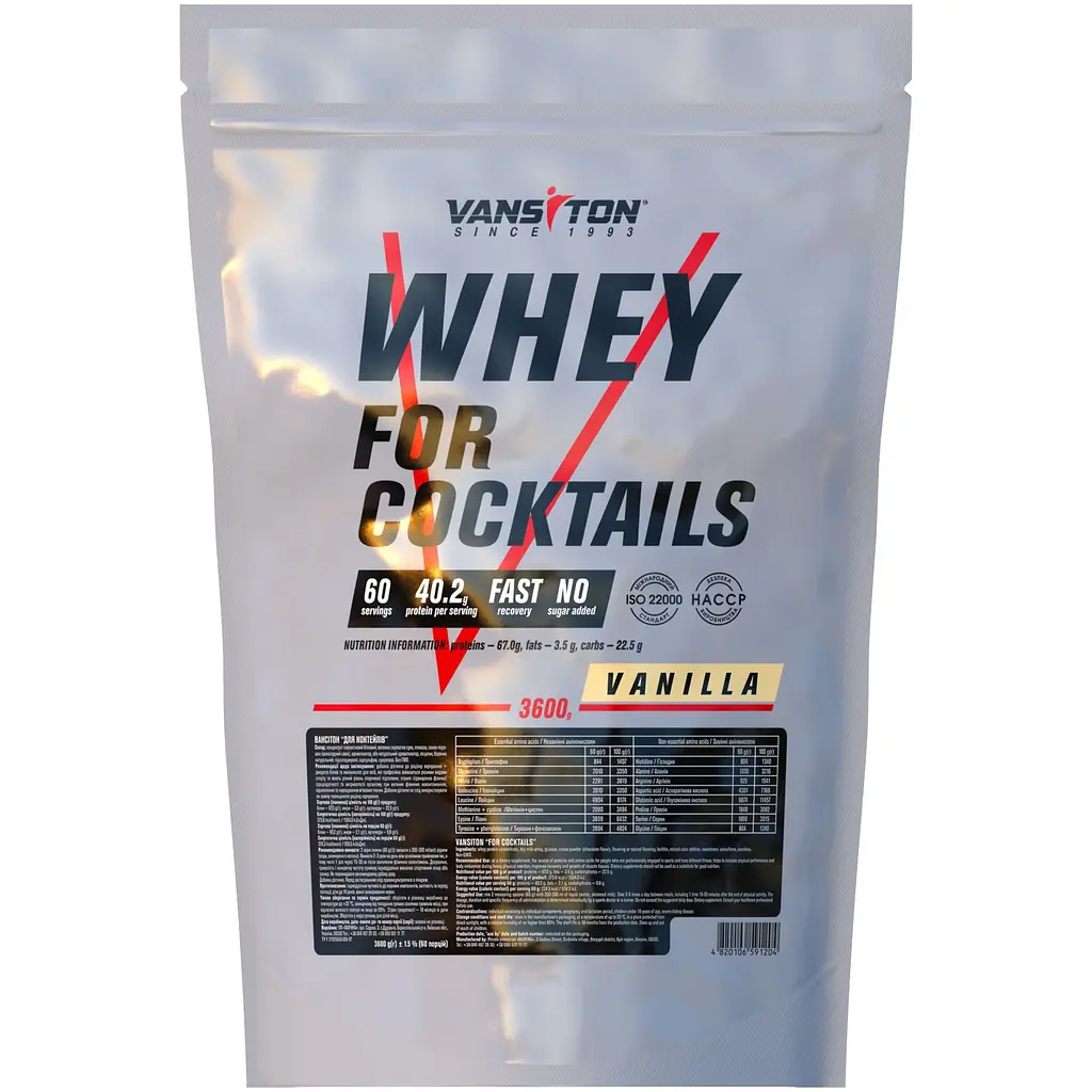 Протеїн для коктейлів Vansiton виготовляється з білкового концентрату молочної сироватки з додаванням швидкозасвоюваного вуглеводу - глюкози.
