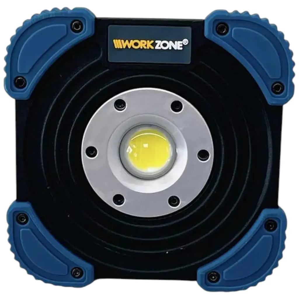 Потужний портативний прожектор 10 Вт із вбудованим літій-іонним акумулятором, ударостійкий, із захистом від перезаряджання та низького рівня заряду та індикатором стану акумулятора.