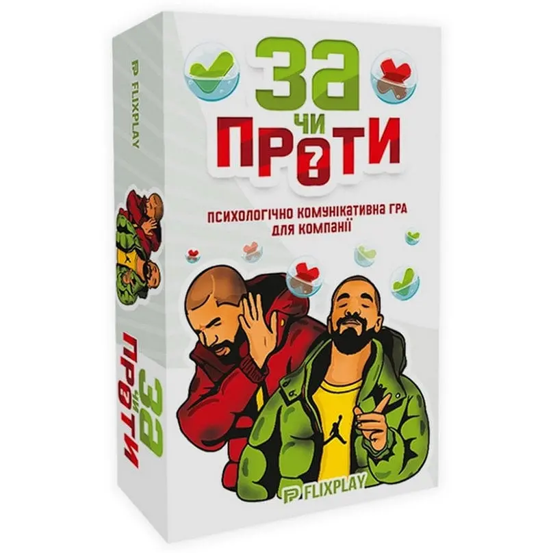 Психологічно-комунікабельна гра За чи Проти? Вам необходно навести аргументи "За" чи "Проти" в конкретній ситуації, описаній на картці. Ваш вибір - це не ваше бажання, картку ви отримуєте "всліпу", не знаючи, що на ній написано. Гравець потрапляє у ситуацію де йоиу треба стати або на сторону захисту, або на сторону звинувачення незалежно від власнї думки та переконань. "За чи Проти?" - це комунікабельна настільна гра психологічного характеру. Граючи з друзями ви не просто весело проведете час, а ще відкриєте їх з іншої сторони, потренуєте ораторськи навички та акторську майстерність. Гра За чи Проти Правила гри 1. У грі можуть приймати участь від 2 осіб, якщо ваша компанія 4+ людини - розділіться на команди, якщо 3 гравці - кожен раун проходить один на они, а третій гравець по черзі проводить раунд з новим опонентом. 2. Дві колоди карт покладіть "сорочкою" догори. Перемішавши оберіть одну карту. Ви, або ваша команда, буде відстоювати обрану позицію, а суперник(-и) стануть на протилежну сторону. Гра За чи Проти 3. Потім наосліп берете карту з твердженням або міркуванням - виділено червоним (нижче будуть вказані приклади), які допоможуть обгрунтовувати позицію. 4. Кожен гравець, якщо це команда, або по черзі, якщо гра 1 на 1, наводить свій аргумент "За" чи "Проти" - гравець(-ці) з протилежної команди парирують. Так продовжується, доки у одної з сторін не залишиться аргументів. 5. Аргумент має складатися з 2-3 речень пов'язаних одною ідеєю. Короткі відповіді 1-2 словами не зараховуються. Якщо команда, або гравець не може обгрунтувати твердженя - бал дістається протилежній команді. Гра За чи Проти 6. Кожна команда, або гравець, може привести 5 тверджень в бік захисту, або звинуваження. Якщо гравці / команди привели порівну аргументі - оголошується нічия і береться інша картка. 7. Перемагає та команда / той гравець, який отримав більше всього балів за гру. Гра За чи Проти Для кого гра Для друзів, колег. Кількість гравців: 2+ осіб Вік: 16+ років Час гри: 20-60 хвилин