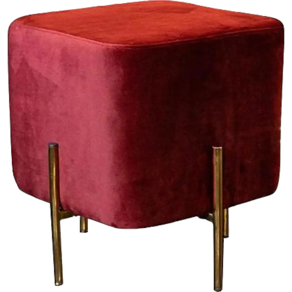 Оббивка цієї моделі у вигляді оксамитової бордової тканини у поєднанні з металевими ніжками кольору золота створюють єдину композицію. Такий цікавий мікс однозначно прикрасить інтер'єр та надасть йому неповторного характеру. Пуф дуже м'який і зручний, може використовуватися як функціональне доповнення спальні, вітальні, вбиральні або салону краси.