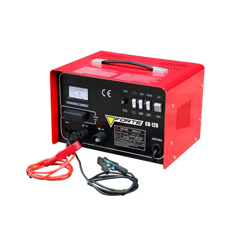 Forte CD-120 – універсальний пристрій, який підходить для заряджання акумуляторів та запуску двигунів. Завдяки компактним розмірам і зручному керуванню його можна використовувати як у гаражах автолюбителів, так і на станціях технічного обслуговування.