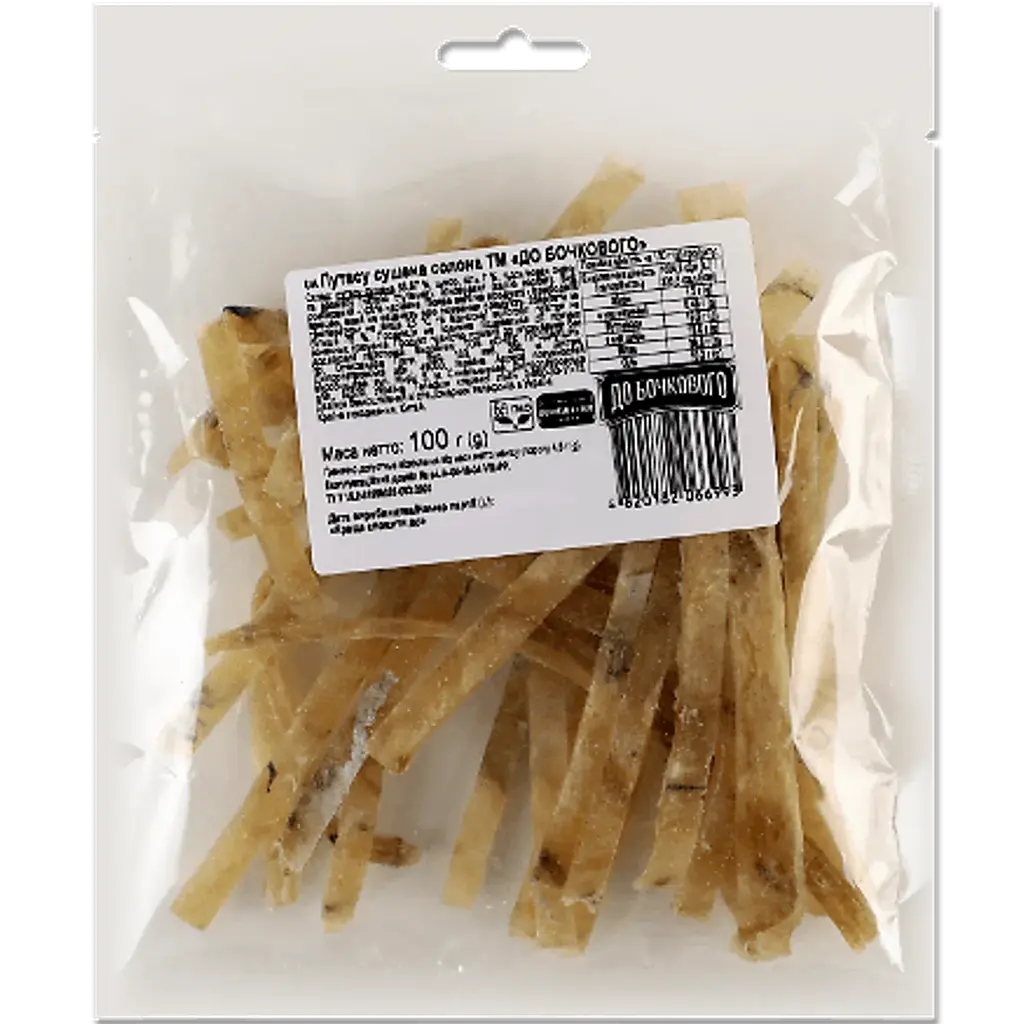 Путасу сушена солона До Бочкового 100 г - це популярний продукт, який часто використовується як закуска або інгредієнт для різних страв. Це філе риби путасу, яке пройшло процес сушіння та соління, а також було приправлене перцем для додання пікантності.