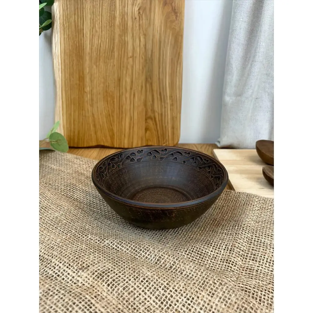 Вишукана піала, прикрашена майстерним гравіюванням, що надає їй особливого етнічного шарму. Ідеально підходить для подачі чаю, десертів або соусів. Завдяки пористій структурі глини виріб зберігає температуру страви, роблячи кожен прийом їжі ще більш приємним.