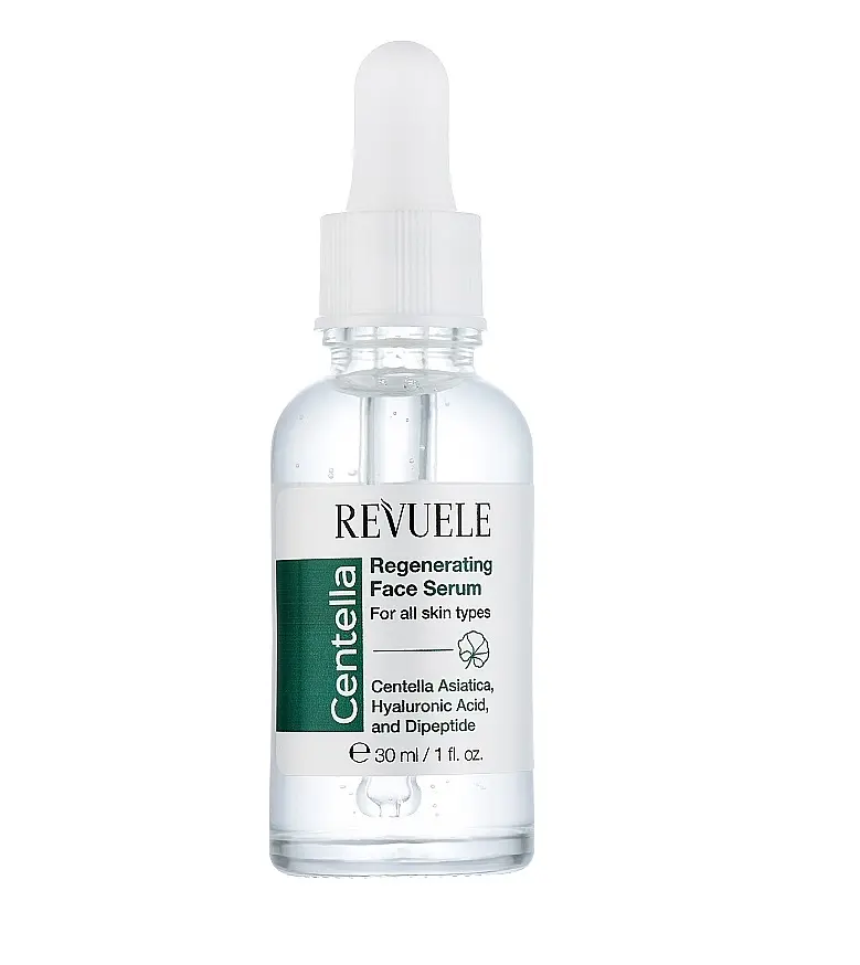 Регенеруюча сироватка для обличчя Revuele Centella Regenerating Face Serum - ультраактивний щоденний догляд за обличчям, що зміцнює, глибоко зволожує шкіру і посилює функцію її відновлення, вирівнює колір обличчя, повертає кожному покриву сяйво і еластичність, стимулює регенерацію та допомагає захистити шкіру від передчасного старіння.