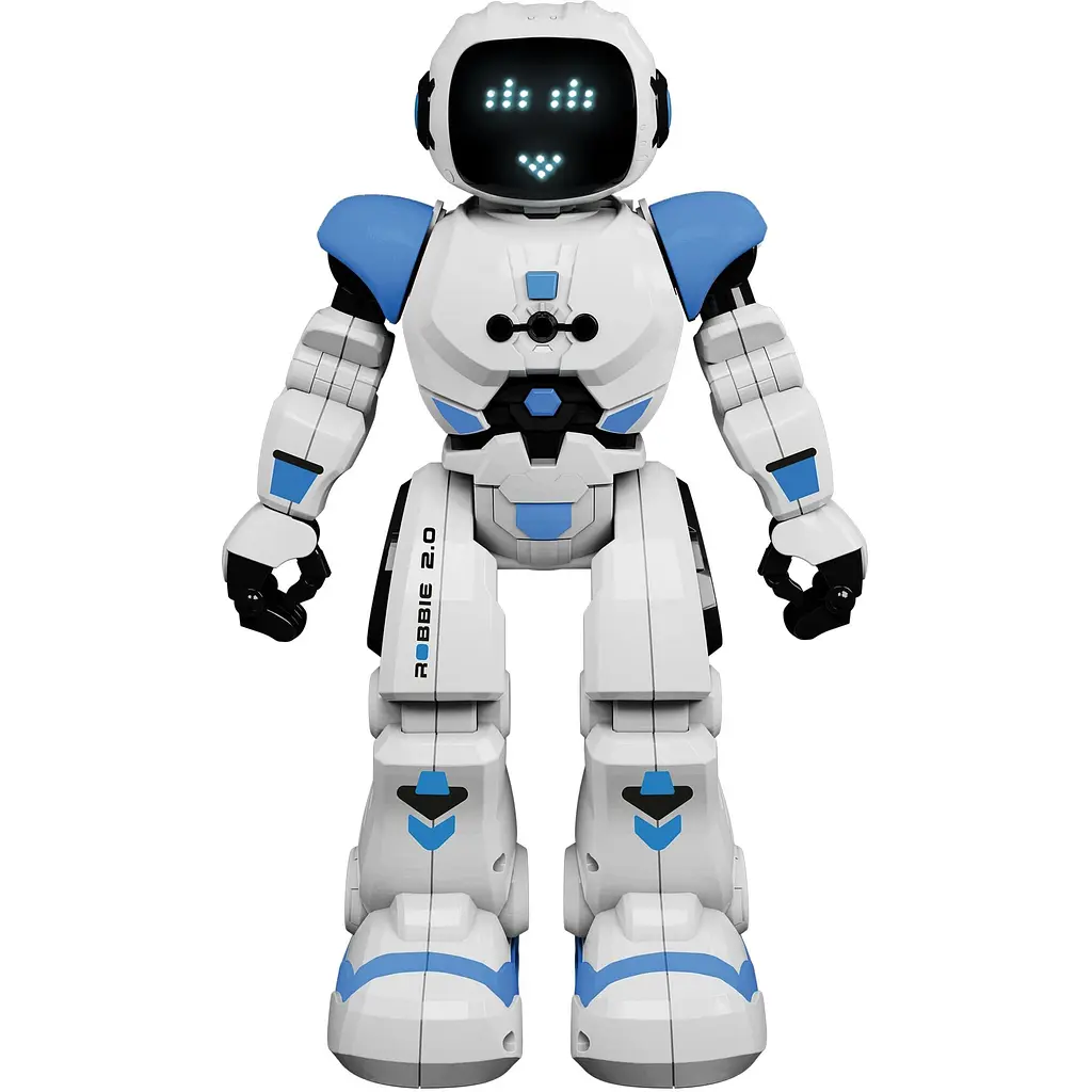 Робот Xtrem Bots Blue Rocket Роббі 2.0 Stem запрошує вас у нові пригоди! Він може рухатись, ходити, танцювати, видавати звуки та змінювати емоції! Керування роботом відбувається завдяки пульту (радіус дії до 5 м), а також деякі функції активуються рухами. Вмикається і вимикається робот шляхом натискання кнопки на тулубі. Сам робот працює від акумулятора, який заряджається від USB-кабелю, а пульт керування - від батарейок.