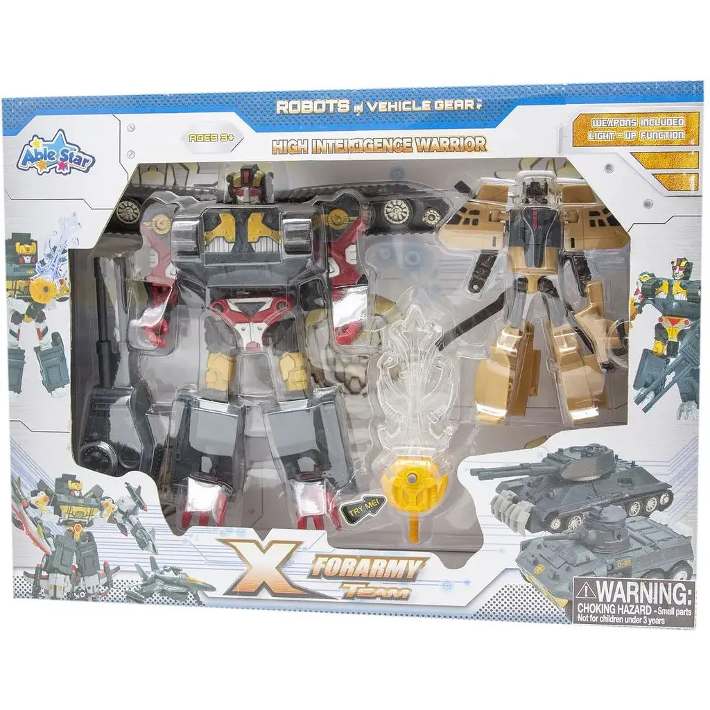 Набір армійських роботів Able Star - ці стильні роботи з легкістю трансформуються в круту військову техніку і навпаки. У наборі є світловий меч - грізна зброя войовничих роботів. З таким набором вашому хлопчику не доведеться нудьгувати. Граючи, дитина пізнає світ, розвиває фантазію та уяву.