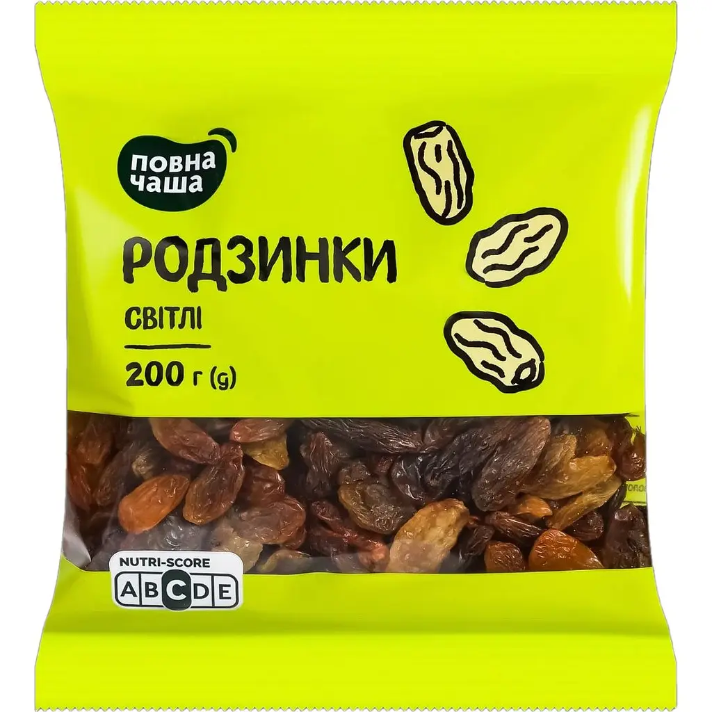 Родзинки Повна Чаша - це натуральний сухофрукт, виготовлений шляхом сушіння соковитих виноградних ягід. Ці родзинки мають солодкий смак і хрустку текстуру, що робить їх ідеальними для вживання як перекус або складників в різноманітних стравах.