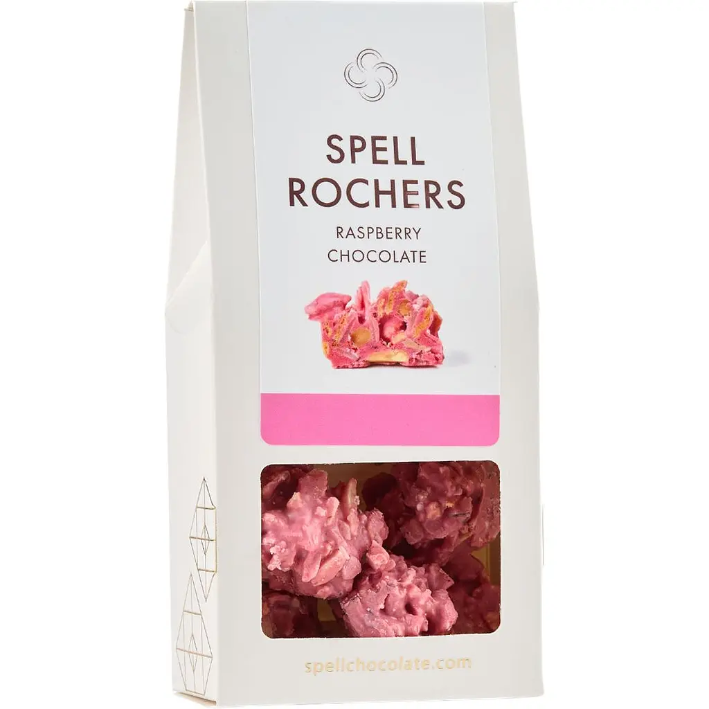 Можна до цього дня додати класичні снеки, але краще - шоколадні рошери від Spell. Цукерки у вершковому білому шоколаді, з хрумких мигдальних паличок у поєднанні з сушеним кокосом та запашною сублімованою малиною.