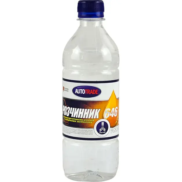 Розчинник 646 Автотрейд є універсальним розчинником, який швидко та ефективно розчиняє фарбу, мазут та інші хімічні сполуки. Цим засобом можна користуватися, якщо необхідно знежирити якусь поверхню перед фарбуванням.