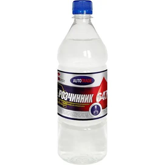 Розчинник Автотрейд 647 являється універсальним розчинником, який швидко та ефективно розчиняє фарбу, мазут та інші хімічні сполуки. Цим засобом можна користуватися, якщо необхідно знежирити якусь поверхню перед фарбуванням.