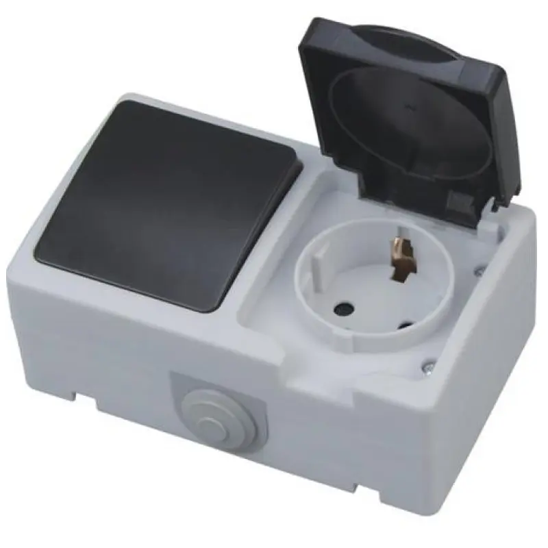 Розетка з заземленням з кришкою + 1-й вимикач - ергономічний та надійний пристрій номінальним струмом 16A, робочою напругою до 250V із заземленням.