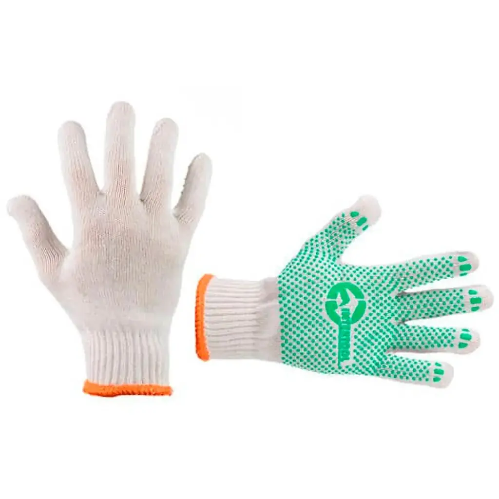 Рукавички бавовняні SP-0126 трикотажні білого кольору. На долоні нанесено ПВХ-покриття, що забезпечує захист рук та надійне захоплення предметів. З еластичними манжетами, що м'яко прилягають до кисті і запобігають попаданню побутового та будівельного сміття всередину рукавичок. Завдяки х/б основі забезпечується вільний повітрообмін. Призначений для виконання будівельних та сільськогосподарських робіт, ручних механозбірних робіт. Розмір: 10"; Манжет: в'язаний з окантовкою; Покриття: ПВХ точки на долоні