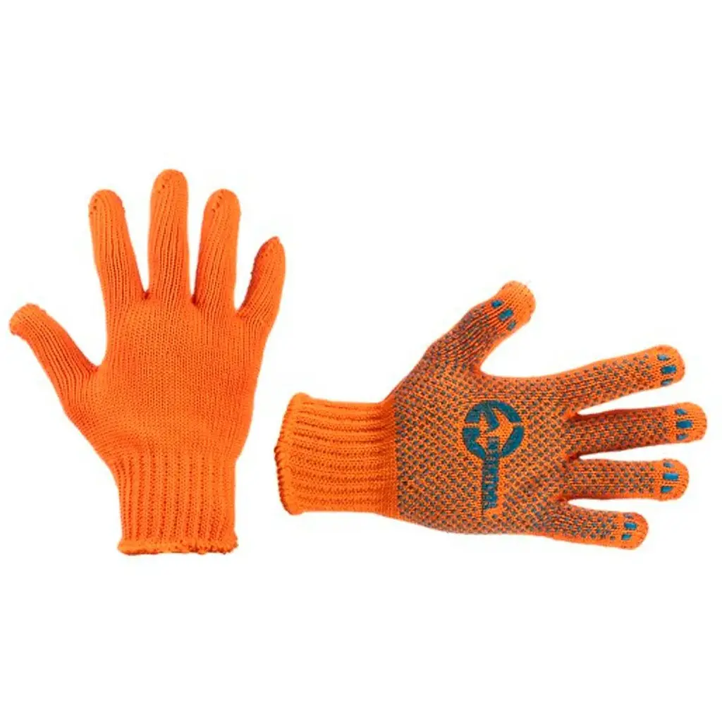 Рукавички бавовняні SP-0135 – трикотажні оранжевого кольору. На долоні нанесено темно-сіре ПВХ-покриття, що забезпечує захист рук та надійне захоплення предметів. З еластичними манжетами, які м'яко прилягають до кисті та запобігають попаданню побутового та будівельного сміття всередину рукавичок. Завдяки х/б основі забезпечується вільний повітрообмін. Призначені для виконання будівельних та сільськогосподарських робіт, ручних механозбірних робіт. Розмір: 9"; В'язка: 7 петель на 1", безшовна; Манжет: в'язаний з окантовкою; Покриття: чорні ПВХ точки на долоні